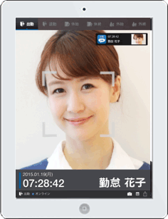 タブレット端末「iPad」の内蔵カメラで顔を撮影するだけの簡単な操作で本人を認証し、出退勤時刻を記録できます。